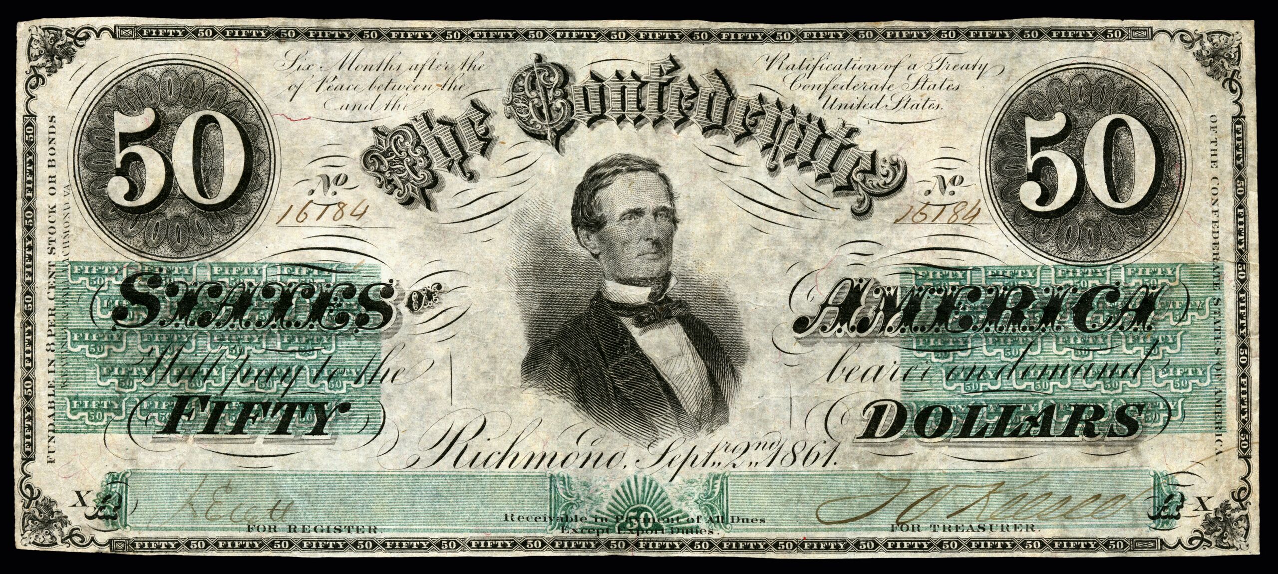 English: Third series $50 Confederate States of America banknote. Uniface. Portrait of Jefferson Davis.