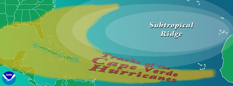 English: Graphic showing the typical track of a en:Cape Verde-type hurricane. The tracks begin south of en:Cape Verde in the eastern en:Atlantic Ocean.