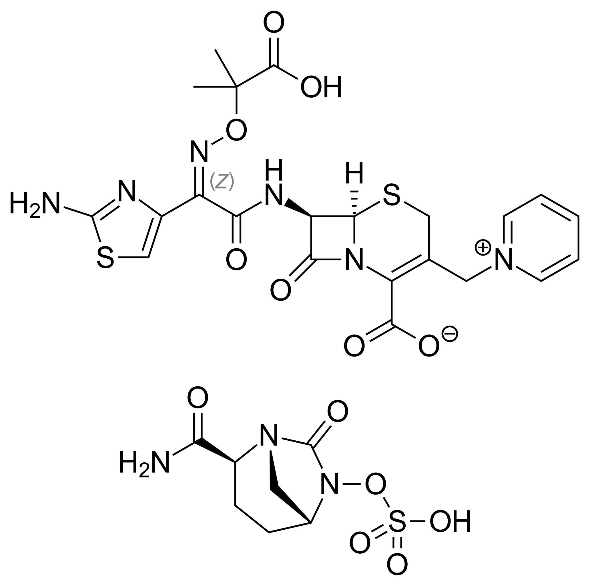 English: Skeletal formulae of ceftazidime and avibactam, which are parts of a combination drug named Avycaz®. This medication is indicated in the management of complicated intra-abdominal infections (in combination with metronidazole). Created with ChemDoodle 7.0.2 and Adobe Illustrator CC 2015.