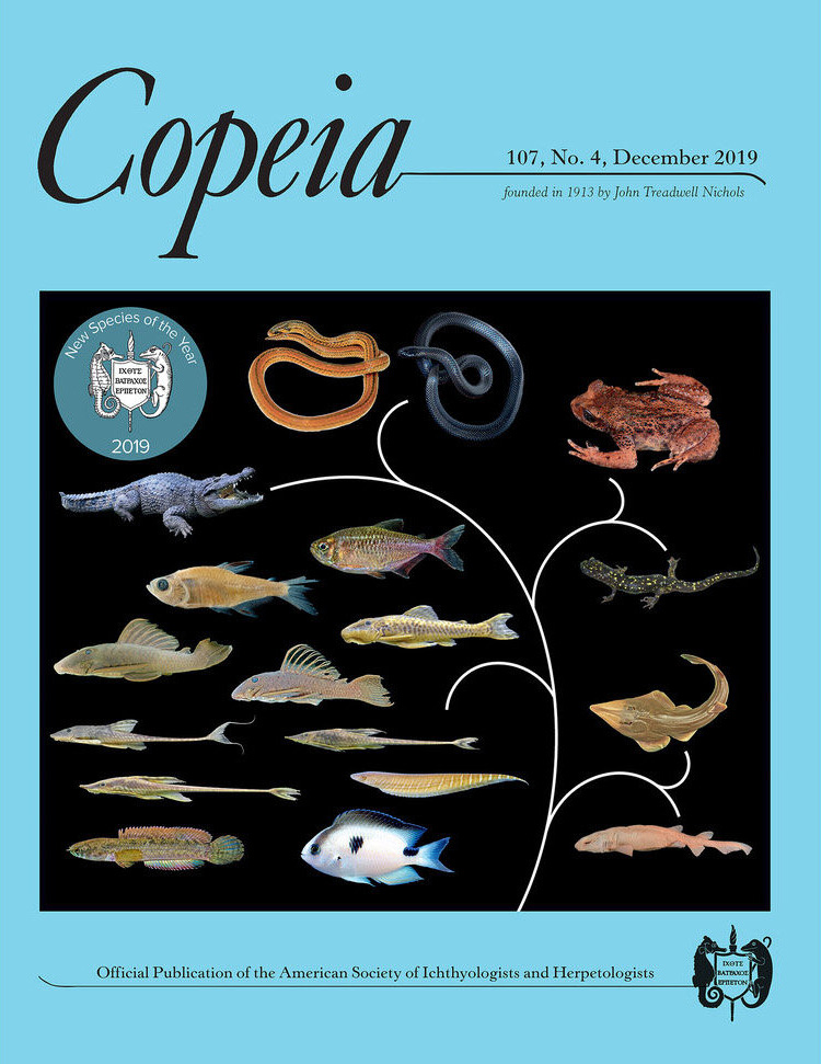 English: Copeia released their 2019 cover of the scientific journal, Copeia, to Creative Commons. The image includes the evolutionary relationships of all the new species that were described in their journal in 2019 ranging from sharks to catfishes to frogs to snakes to a new crocodile.