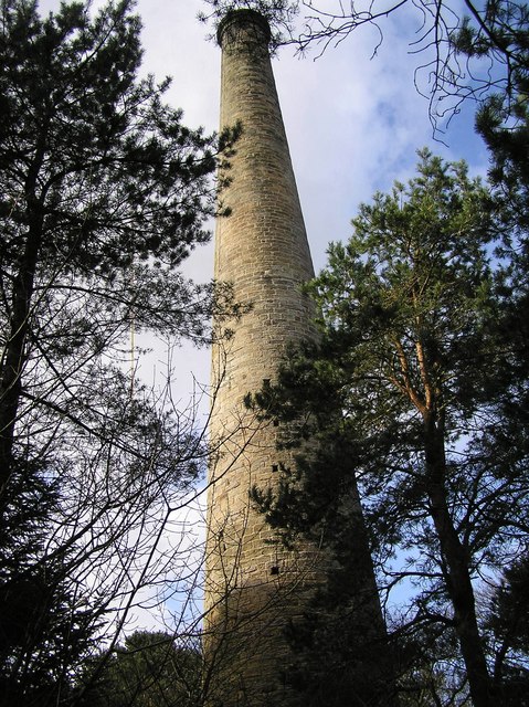 English: Copley Chimney, Copley, County Durham. This sandstone chimney built in 1832, for the Gaunless smelt Mill, now stands alone in Gibbsneese Plantation above the River Gaunless.