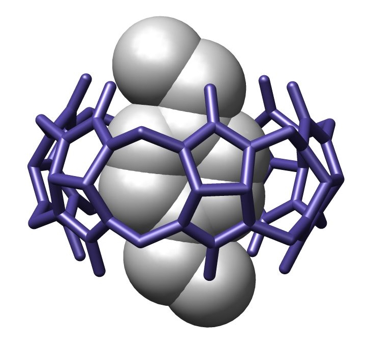 English: This is a picture generated from crystal structure data reported by Wade A. Freeman in Acta Crystallographica Section B: Structural Science, Year 1984, Pages 382-387. It shows a p-xylylenediammonium bound within a cucurbit[6]uril. It was made by myself and is free to be used by all.