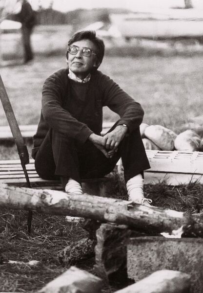 Français : Hélène Viannay assise par terre sur une base des Glénans