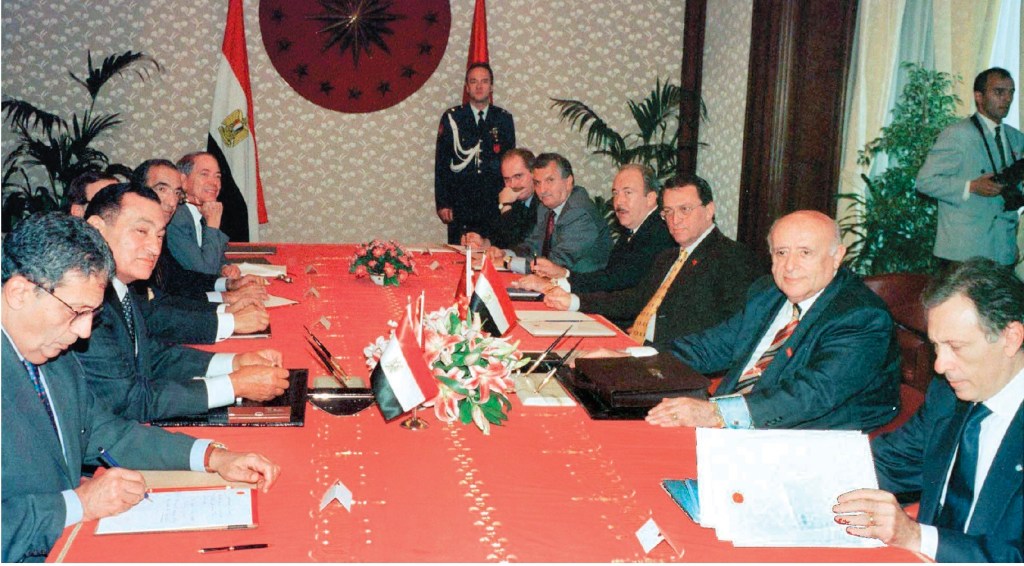 الرئيس المصري حسني مبارك يلتقي رئيس الوزراء التركي سليمان دميرل في أحد جولات الوساطة بين سوريا وتركيا في أنقرة، 6 أكتوبر 1998. والتي أدت إلى التوصل إلى اتفاق أضنة الأمني بين تركيا وسوريا، الذي قضى بطرد عبد الله أوجلان زعيم حزب العمال الكردستاني من سوريا.