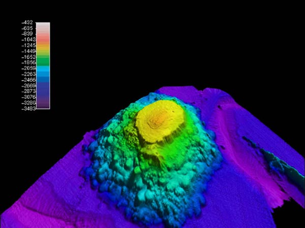 English: Multibeam image of Denson Seamount, looking approximately northwest.
