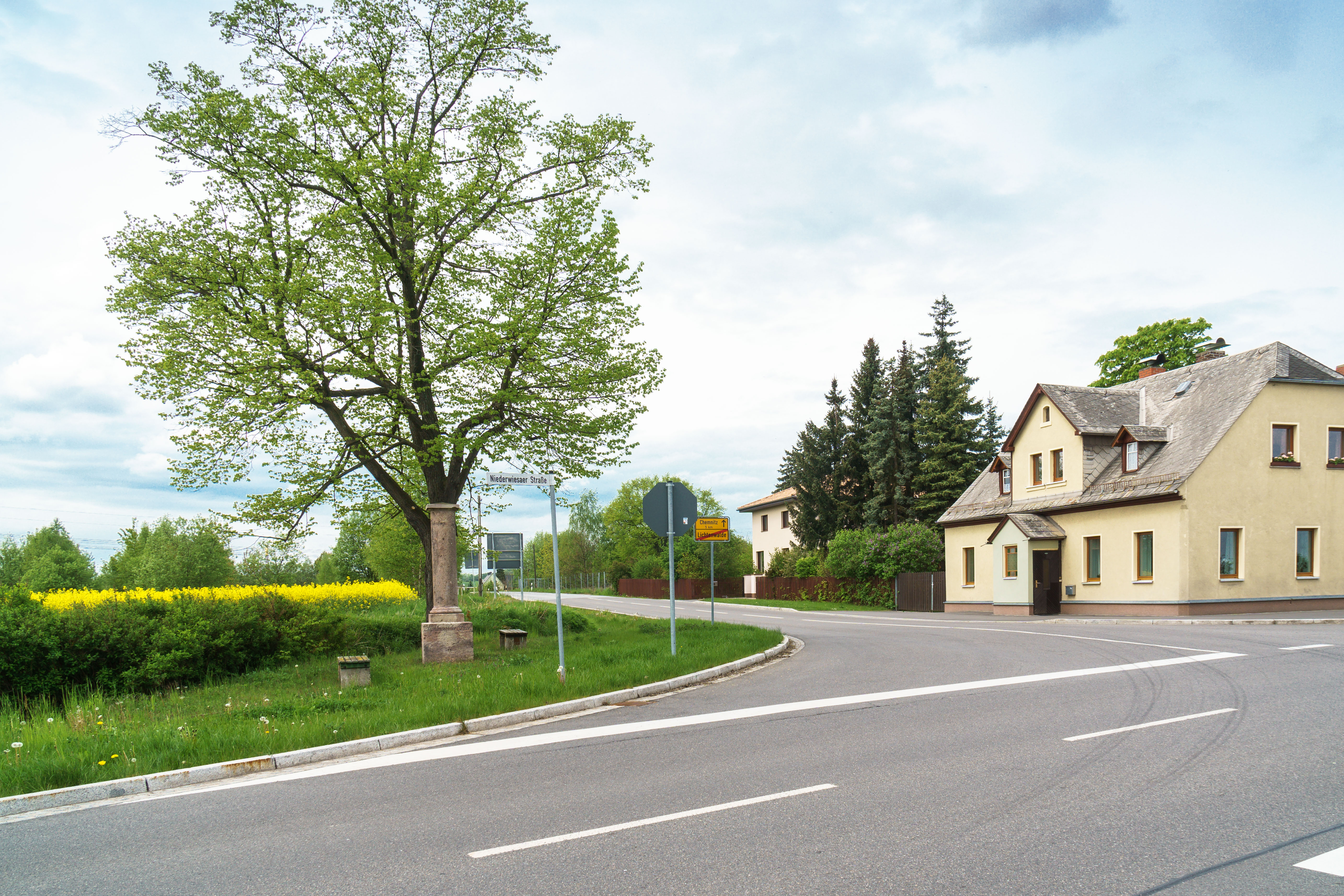 Deutsch: Gemarkungssäule am Ortseingang von Ebersdorf (Lichtenwalder Höhe / Wettinhöhe) in Chemnitz OT Ebersdorf; im Bildvordergrund die zu Lichtenwalde gehörige Niederwiesaer Straße (S 238), mittig im Bildhintergrund die zu Chemnitz-Ebersdorf gehörende Straße Lichtenwalder Höhe.