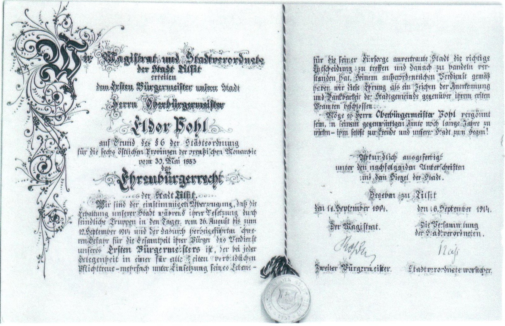 Deutsch: Ehrenbürgerurkunde der Stadt Tilsit für Eldor Pohl