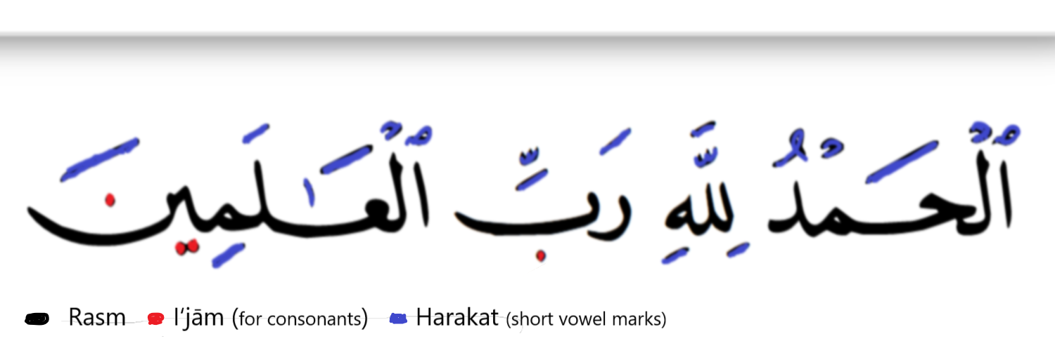 English: Example of the different elements of Arabic script -- Rasm, I‘jām and Harakat