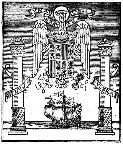 Art. 2º Su emblema consistirá en el escudo oficial del Estado Español sobre una carabela navegando a cuyos lados van colocadas las dos columnas clásicas con la leyenda del Plus Ultra conforme al adjunto diseño: ![]() |