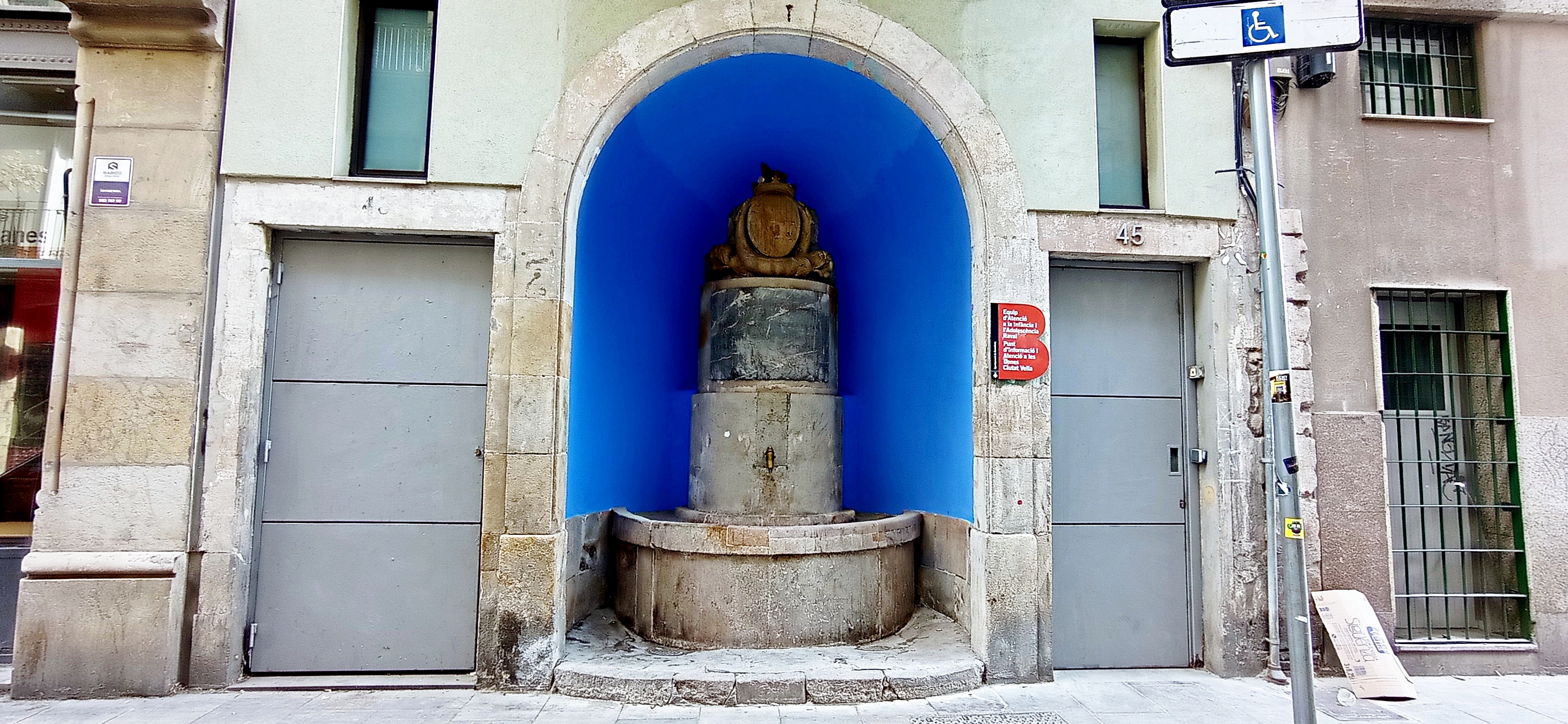 Català: Des del segle XVIII es produeix un augment del consum d'aigua a Barcelona, això obliga a fer-ne noves canalitzacions per estendre el subministrament arreu de la ciutat, i es creen noves fonts i abeuradors. Un exemple és aquesta font del Carrer Nou de la Rambla inaugurada el 1826. Aquesta font de pedra, d'autor desconegut, és dins d'un espai buidat dins del mur de la casa del número 45 del Carrer Nou de la Rambla.