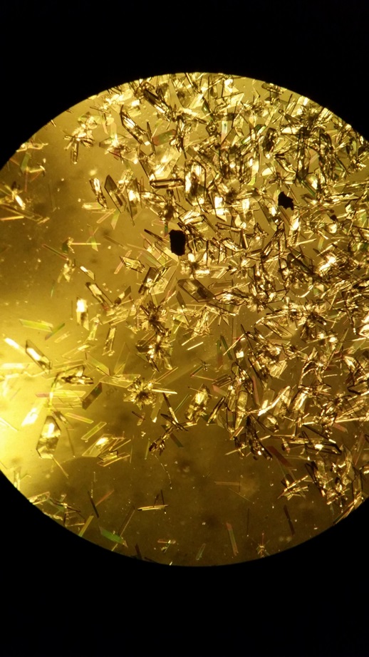 English: In this image crystals of fac-(Re(CO)3(5Me-Sal-Tryp))2 is depicted, as seen through a microscope, with x45 magnification.