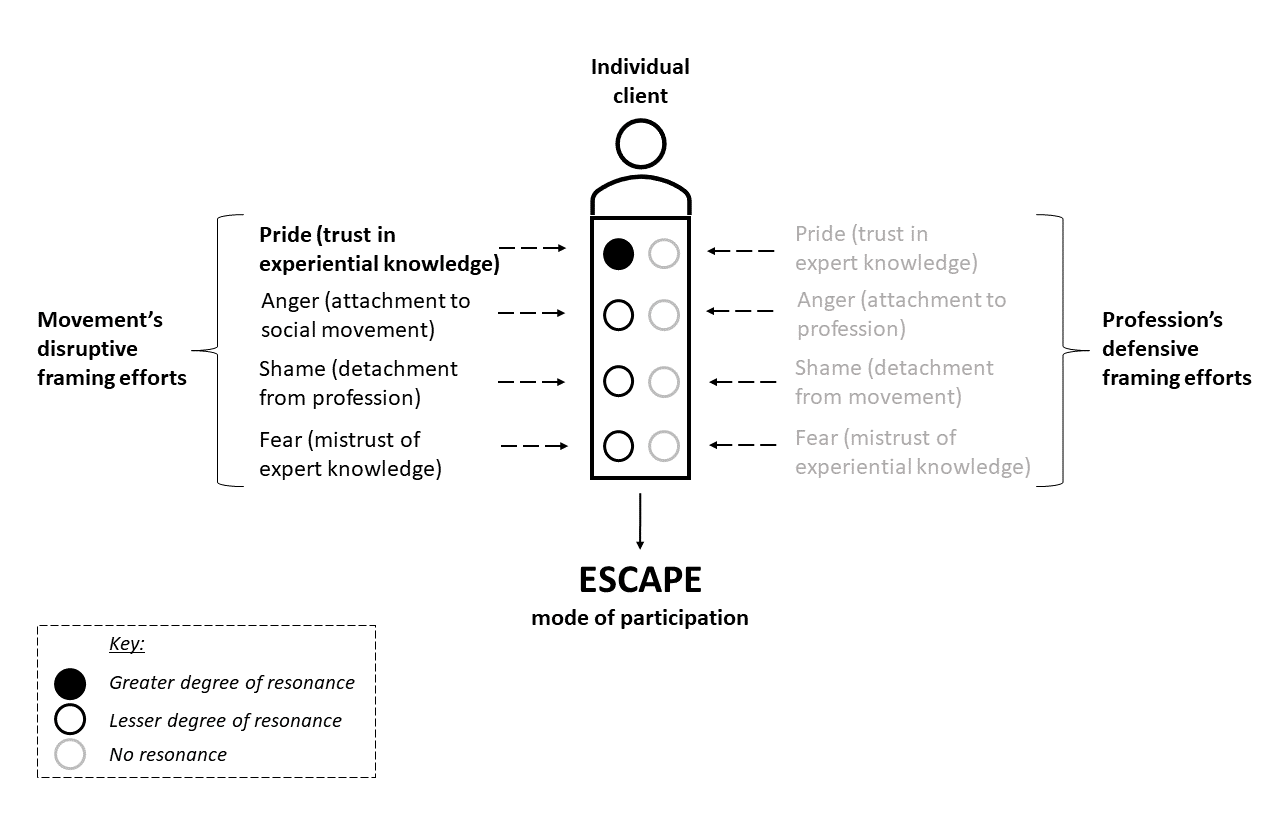 English: Figure 2 - Emotional resonance leading a client to enact the ‘escape’ mode of participation in the article Emotions and client participation in jurisdictional contestation published in Academy of Management Review in December 2022.