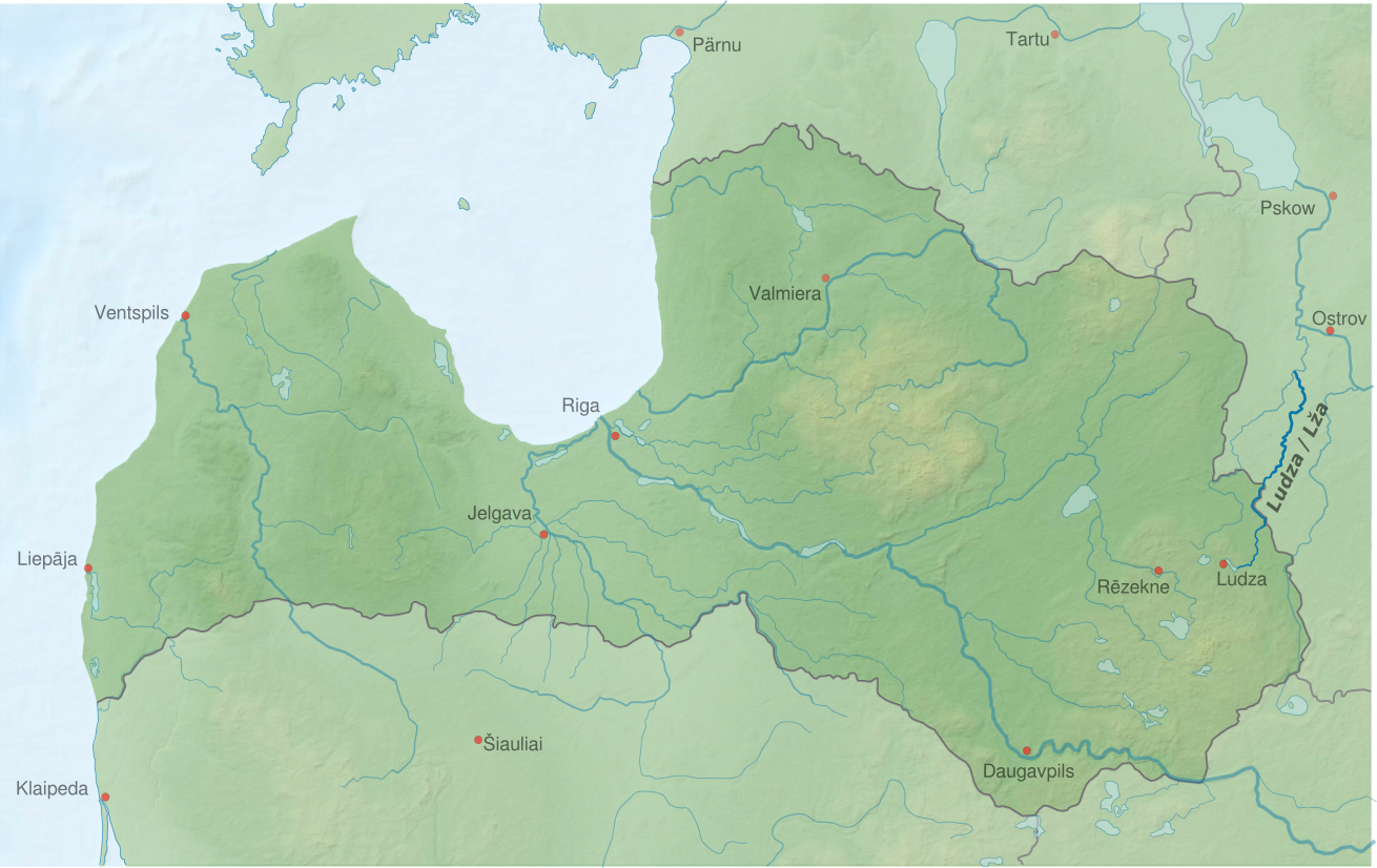 English: Map of river Ludza in Latvia and Russia based on relief-location maps by users: NNW, Виктор В, Alexrk2, Chumwa, Karlis