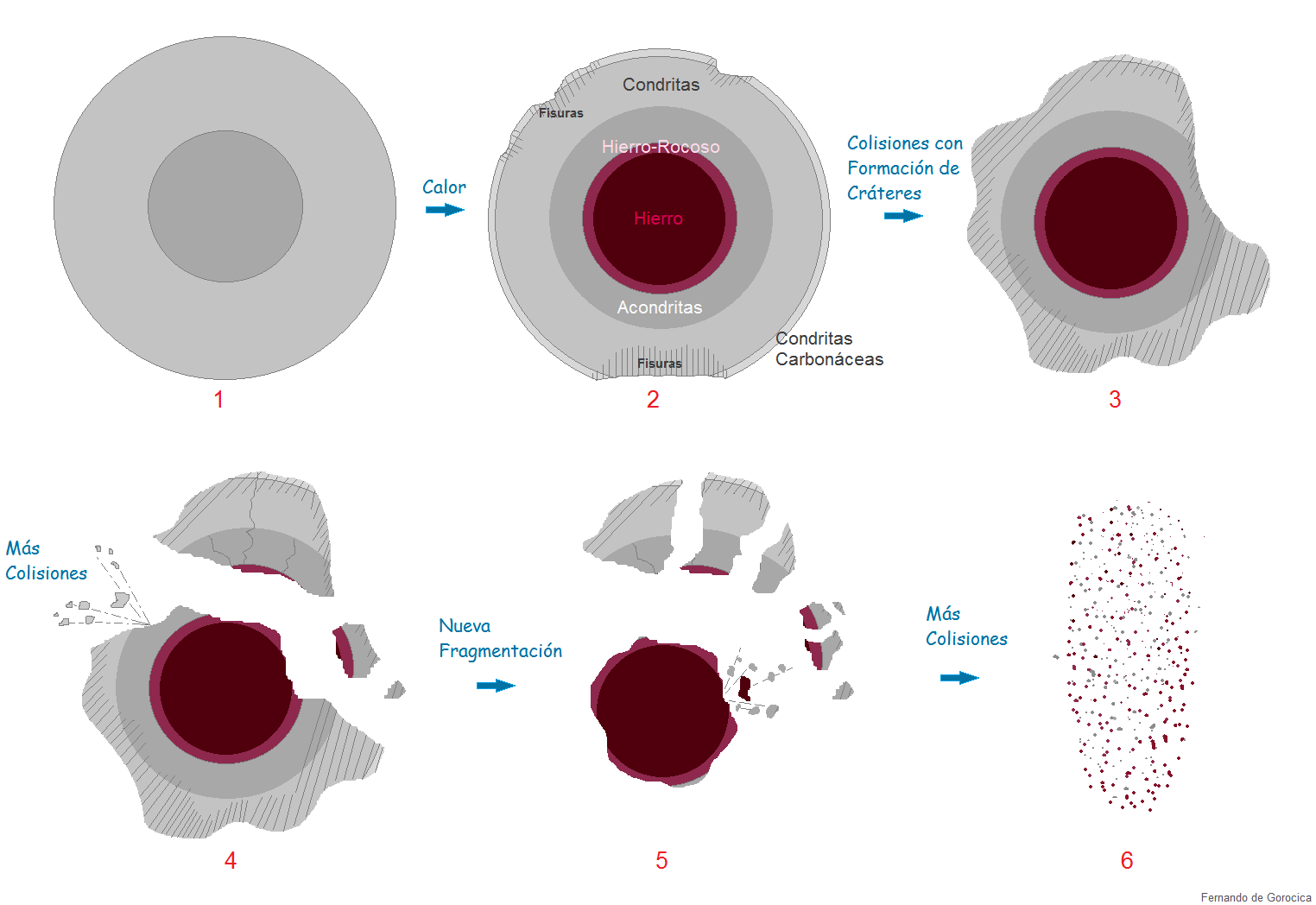 1) El cuerpo primordial pudo haber sido un gran asteroide, por ejemplo de 650 kms de diámetro. No solamente los meteoroides se forman por el impacto entre asteroides o entre sus fragmentos, sino también son partículas o fragmentos cometarios siendo su origen las colas de los cometas formadas por gases y polvo (silicatos), a su vez creadas por sublimación al acercarse el astro al Sol. |