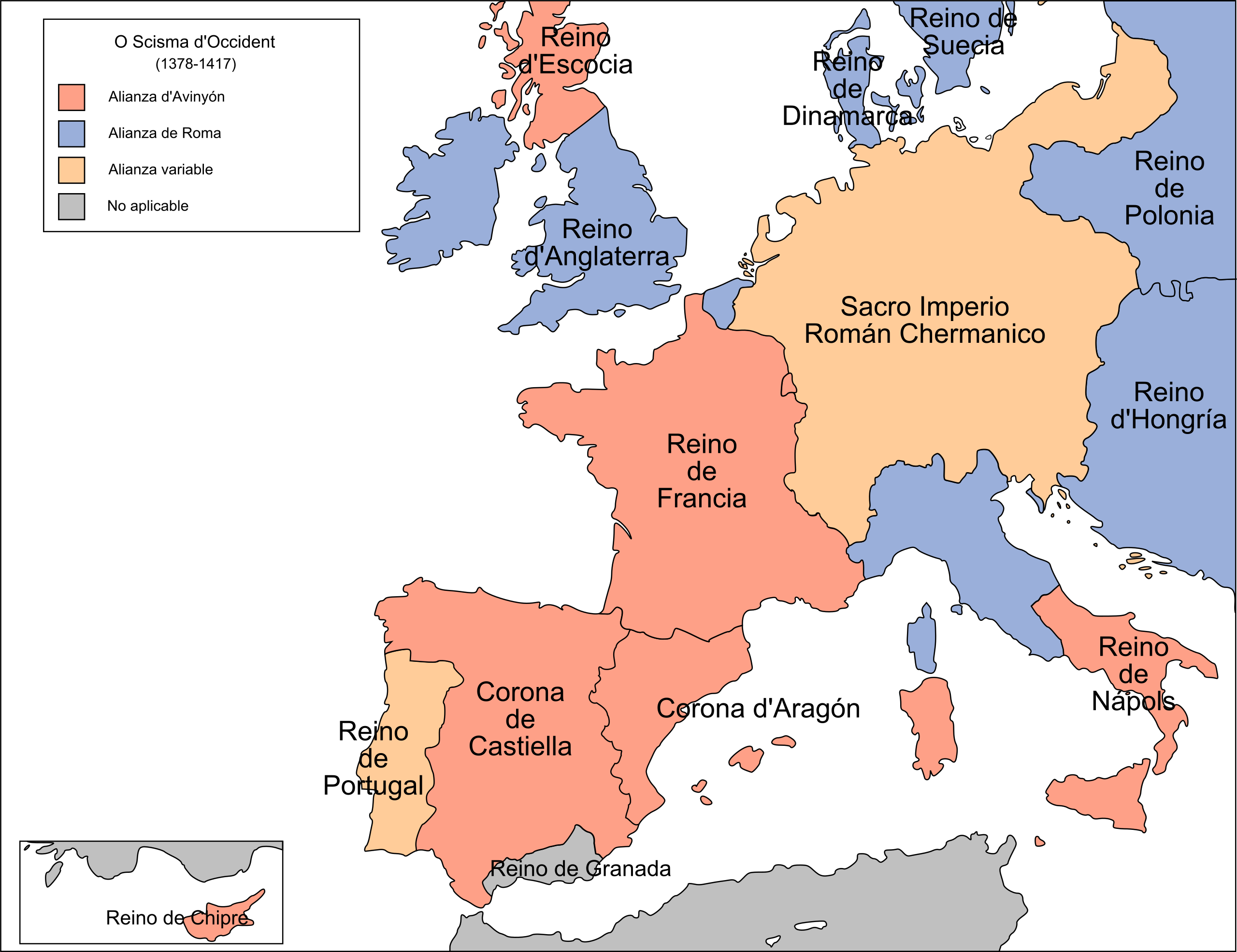 [This is a retouched picture, which means that it has been digitally altered from its original version. Modifications: Converted to SVG. Apologies, I don't speak French.. The original can be viewed here: Grand_schisme_1378-1417.png. Modifications made by Mipmapped.] Error: {{Lang}}: text has italic markup (help)