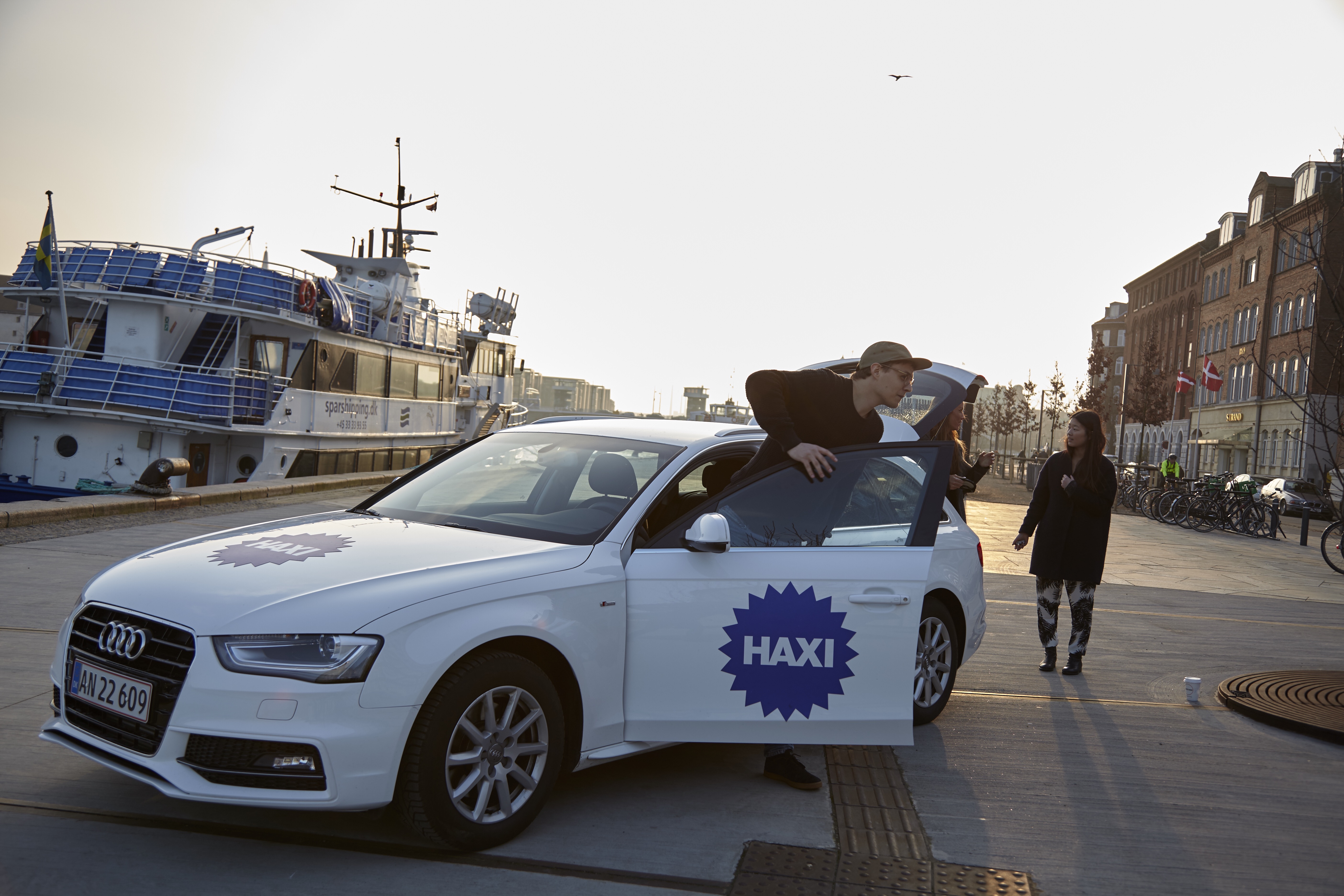 English: Haxi driver picks up carpooling passengers at the Copenhagen Harbor