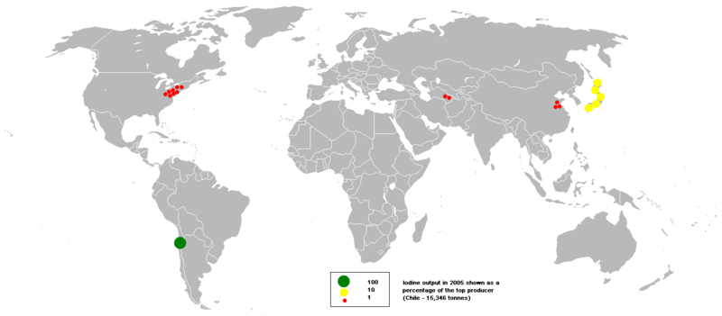 This bubble map shows the global distribution of iodine output in 2005 as a percentage of the top producer (Chile - 15,346 tonnes).