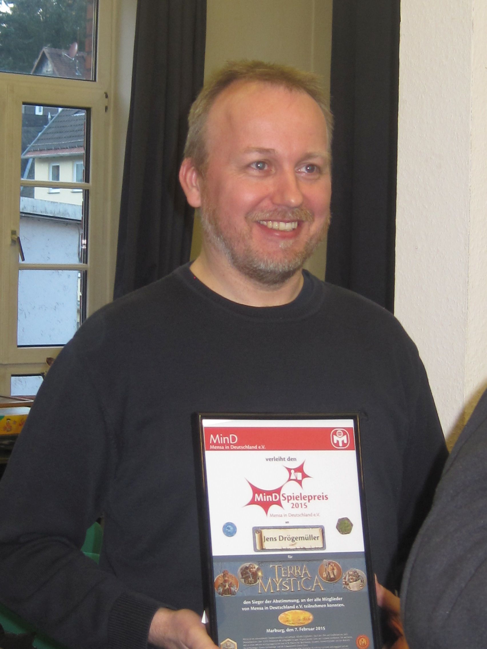 Deutsch: der deutsche Spieleautor Jens Drogemüller mit der Urkunde des Mind Spielepreises 2015 für Terra Mystica.