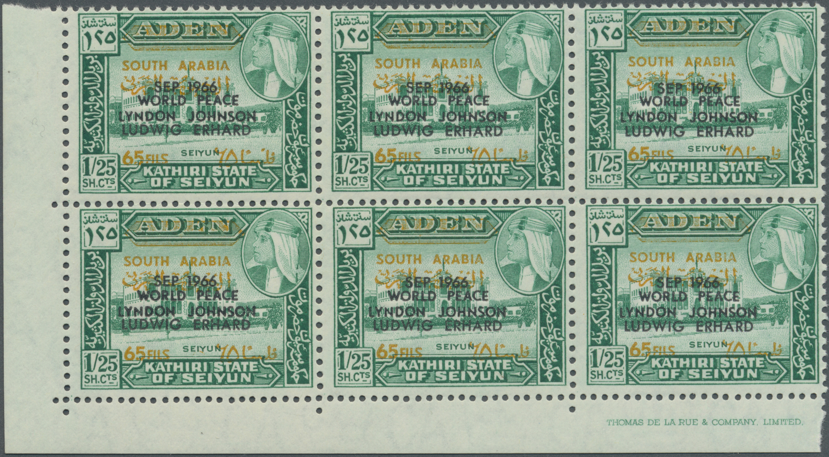 طوابع بريدية من الدولة الكثيرية (حضرموت، الجنوب العربي) بمناسبة قمة السلام العالمي في سبتمبر 1966 بين الرئيس الأمريكي لندون جونسون والمستشار الألماني لودڤيگ إرهارد.