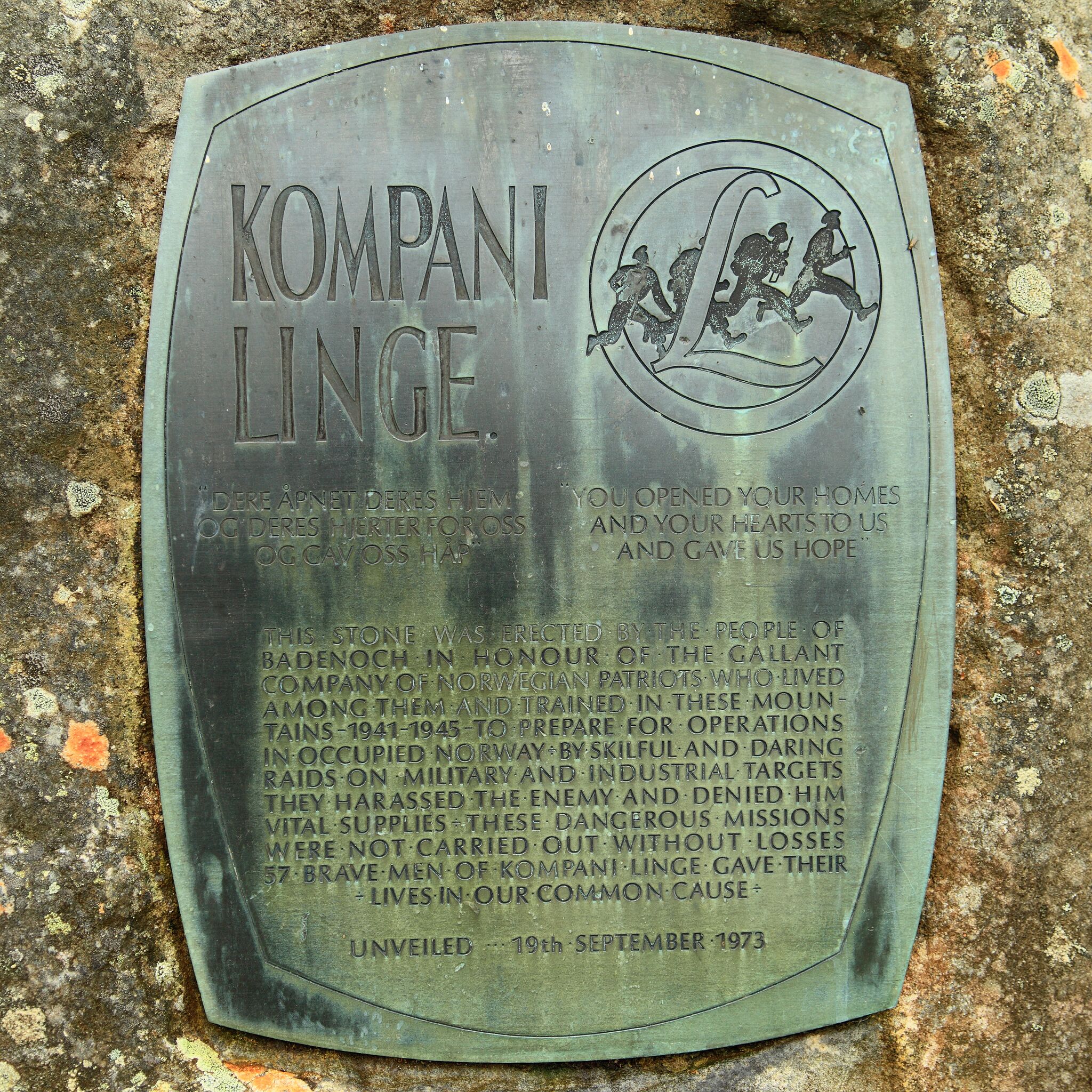 "Dere åpnet deres hjem og deres hjerter for oss og gav oss håp." "You opened your homes and your hearts to us and gave us hope." This stone was erected by the people of Badenoch in honour of the gallant company of Norwegian patriots who lived among them and trained in these mountains 1941-1945 to prepare for operations in occupied Norway. By skilful and daring raids on military and industrial targets they harassed the enemy and denied him vital supplies. These dangerous missions were not carried out without losses; 57 brave men of Kompani Linge gave their lives in our common cause. Unveiled 19th September 1973' |