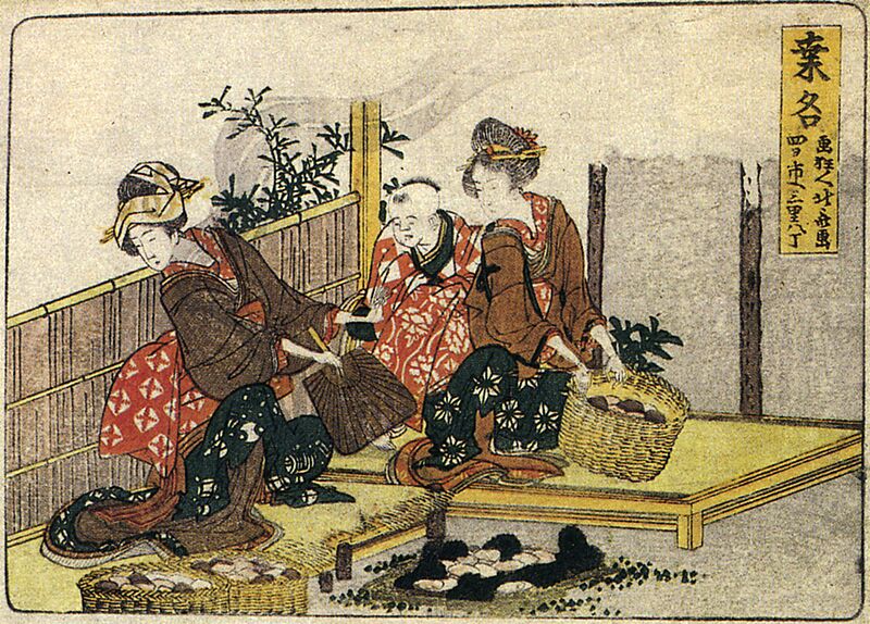English: Kuwana (Baking clams (Meretrix lusoria, Hamaguri) using pinecones as fuel in Kuwana, Japan)