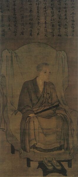 English: Portrait of Lanxi Daolong (Rankei Dōryū) (絹本淡彩蘭溪道隆像, kenpon tansai rankei dōryūzō). Hanging scroll, 104.8 cm x 46.4 cm. Light color on silk.