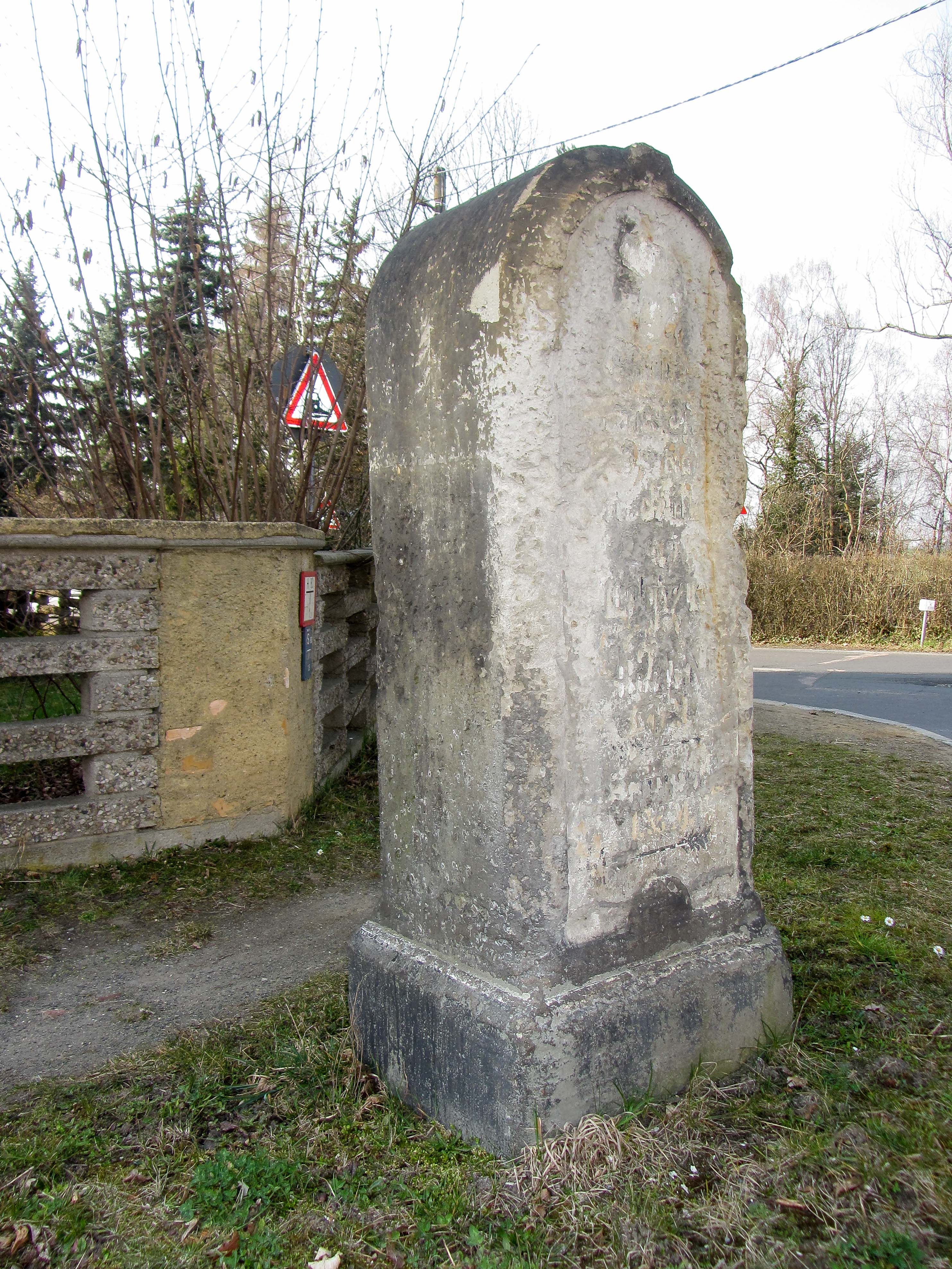 Text⧼colon⧽ Verwittert und schlecht lesbar, zu entziffern war noch: Seite 1 Frohburg 16,6 km. / Borna 10,8 km. / Grimma 11,0 km. / Seite 2 ?? 29,1 km. / Richtungsweiser |
