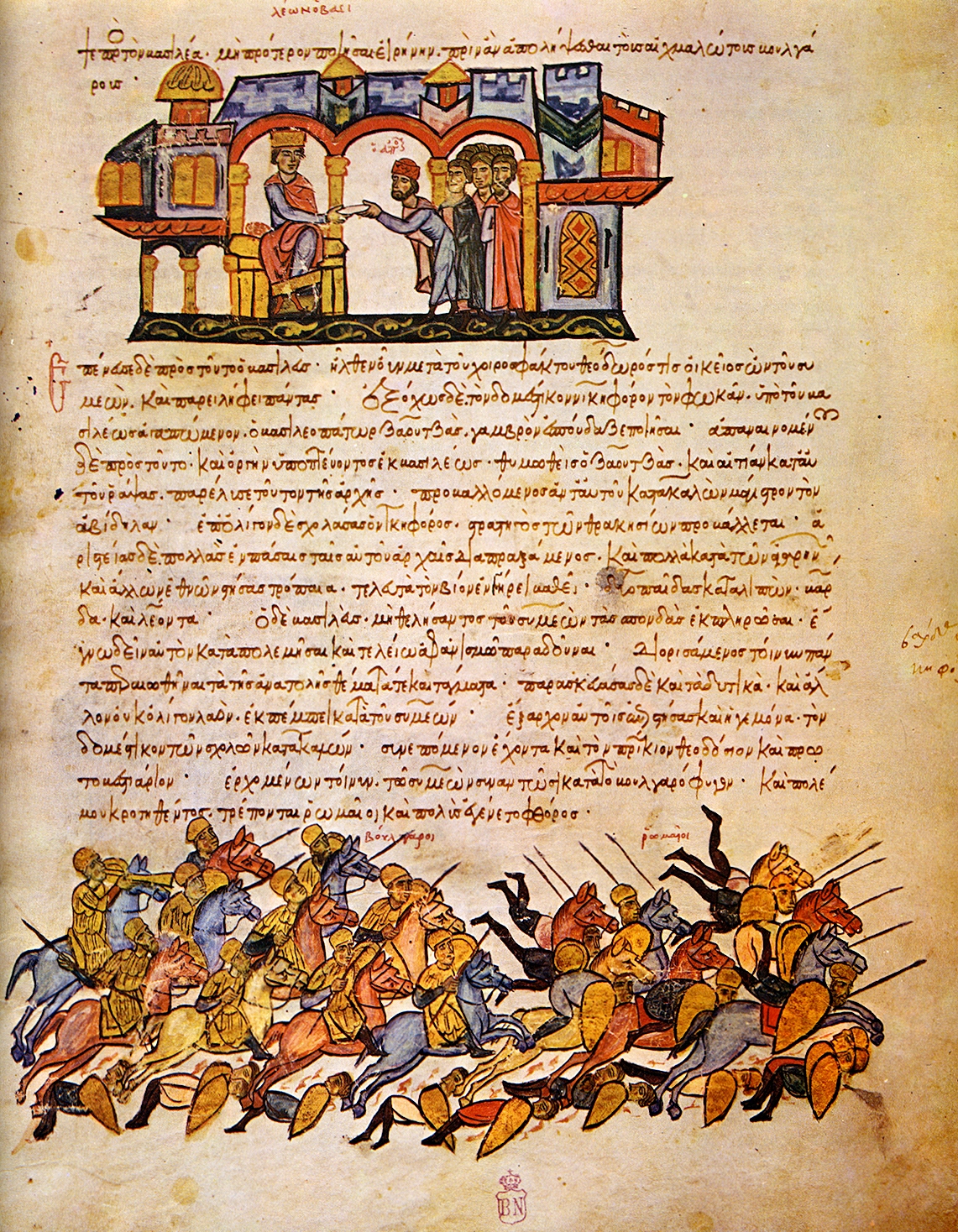 Leon VI with a Bulgarian delegation; The Bulgarians routing the Byzantine forces at Bulgarophygon. en:Madrid Skylitzes, fol. 109r |