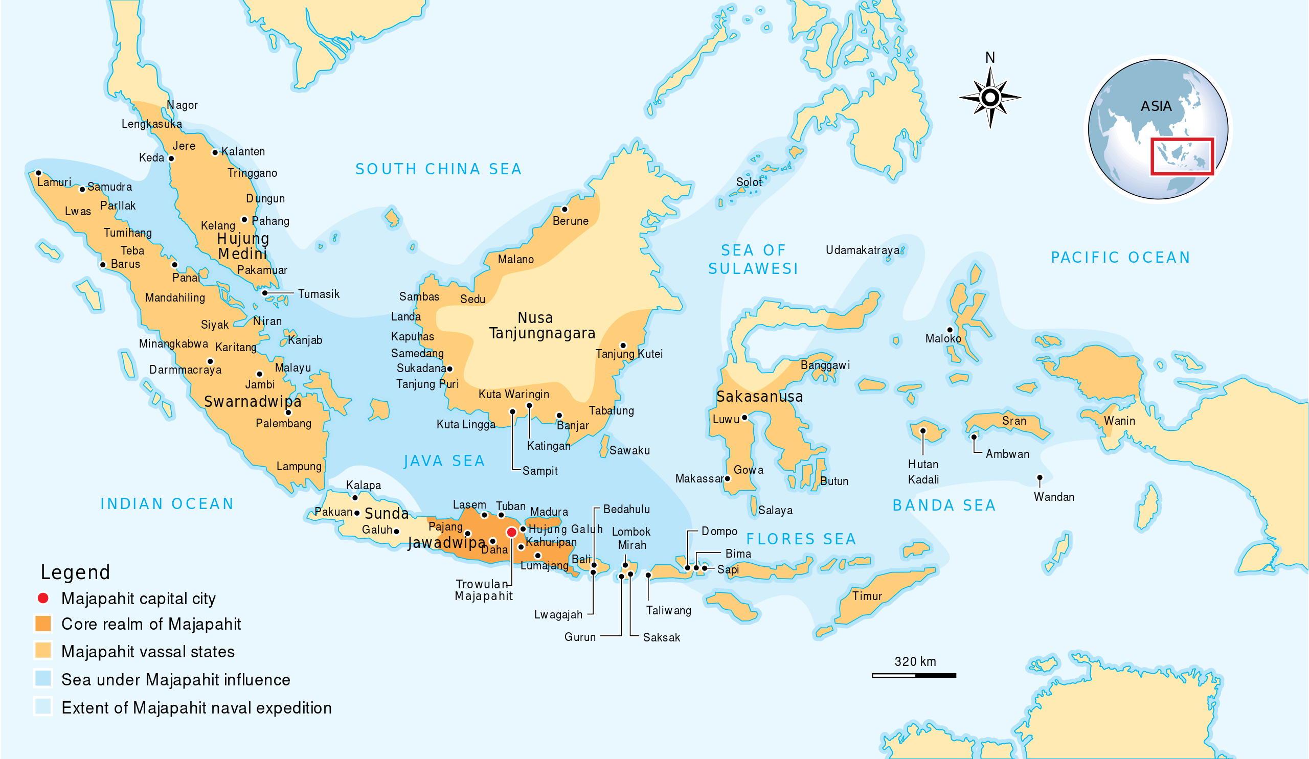 The red dot is Trowulan; Majapahit capital city. The dark orange area is core realm of Majapahit on eastern part of Java. The light orange area is vassal states of Majapahit mentioned in Nagarakretagama. The pale yellow is outer realm or independent states from Majapahit. The dark cyan is the sea area under influence or effective control of Majapahit. The light cyan is the extent of Majapahit naval expedition.