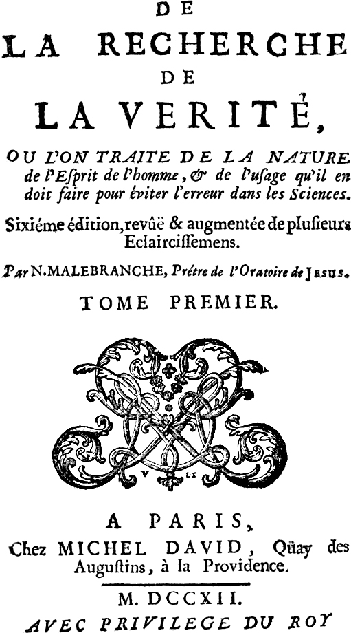 Title page of Concerning the Search after Truth. In which is treated the nature of the human mind and the use that must be made of it to avoid error in the sciences (1674-75) by Nicolas Malebranche (1638-1715). |