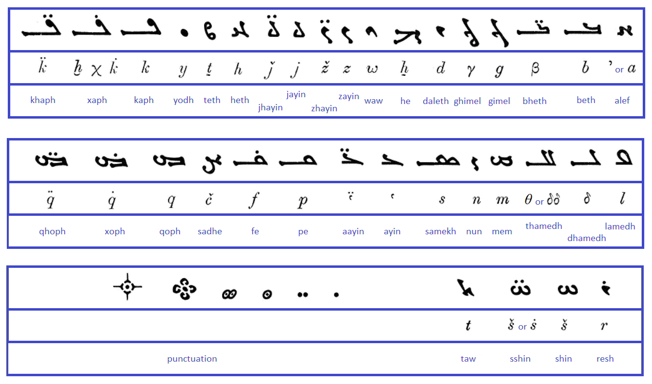 Glyphs are mostly taken from a page out of Alphabete und Schriftzeichen, or were created by adding extra pointing to the originals. (Original author and publication details of the book are unknown.) I believe the glyphs themselves are not copyrightable, per {{PD-text}} or {{PD-ancient-script}}. Transliterations have been tweaked, based on the usage of several authors in the field. (Details on talk page.) Character names are shortened forms of those used in the Unicode Standard (e.g. "khaph" from "MANICHAEAN LETTER KHAPH", rather than "kaph with two dots".) This is intentionally a simplified view. I have selected only one representative form for each letter, preferring the isolate where possible. Ligatures čy and čn are not included. For a more thorough treatment, please see the original linked above. Also see other documents discussed in Talk. Table arranged using a simple paint program. The purpose is to give readers a general idea of the glyph forms, for those who can't render the corresponding Unicode characters. |