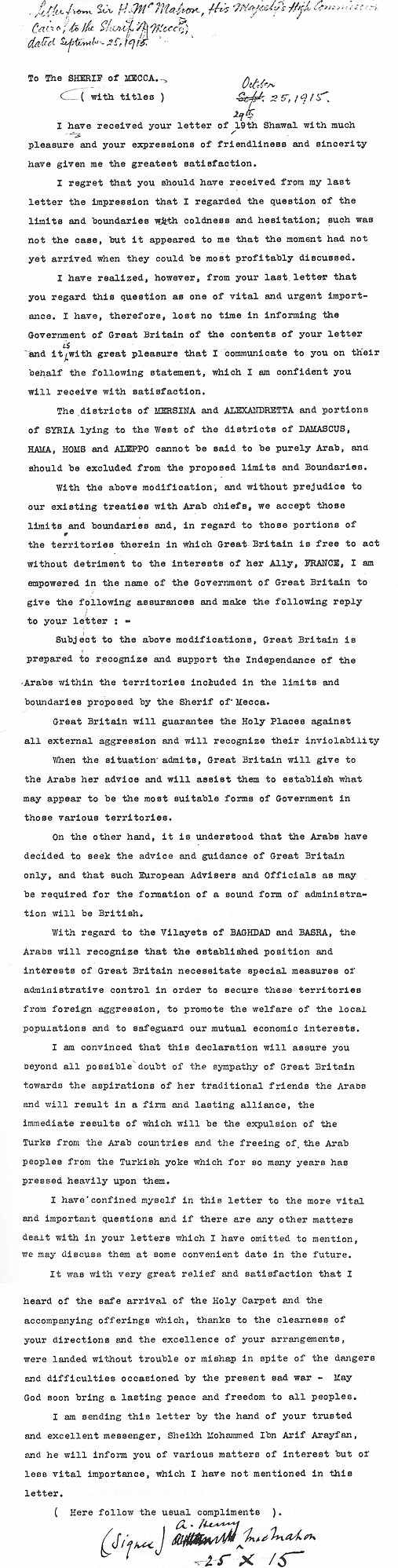 English: McMahon–Hussein Letter 25 October 1915
