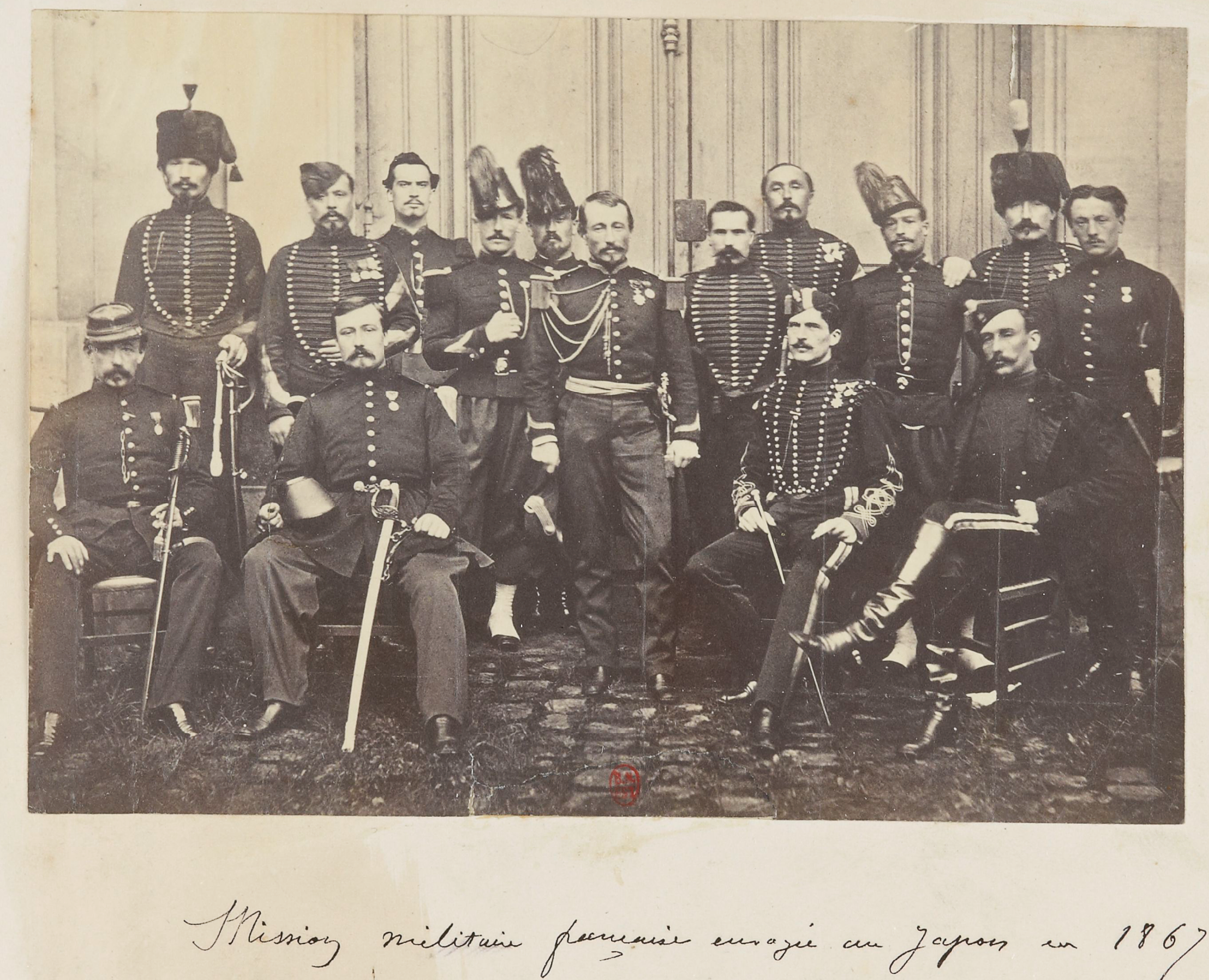 English: Members of French Military Mission to Japan in 1867. In no particular order, they were: Charles Albert Dubousquet, lieutenant Edouard Messelot, lieutenant Léon Descharmes, lieutenant Jules Brunet, lieutenant Jean Marlin, sergeant François Bouffier, sergeant Henry Ygrec, sergeant Emile Peyrussel, sergeant Arthur Fortant, sergeant L. Gutthig, trumpeter Charles Bonnet, chef armurier Barthélémy Izard, sergeant Frédéric Valette, sergeant Jean-Félix Mermet, brigadier Jourdan, captain, engineer Michel, sergeant, engineer Jules Brunet is seated in front, second from right (1866).
