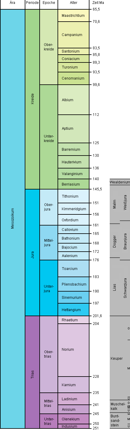 Domerium (Oberpliensbachium), Carixium (Unterpliensbachium), Lotharingium (Obersinemurium), Alaunium (oberhalb der Mitte des Norium), Lacium (unterhalb der Mitte des Norium), Tuvalium (Oberkarnium), Julium (Mittelkarnium), Cordevolium (Unterkarnium), Langobardium (Oberladinium), Fassanium (Unterladinium), Illyrium (Oberanisium), Pelsonium (spätes Unteranisium bis Mittelanisium), Bithynium (mittleres Unteranisium) und Aegeum (frühes Unteranisium) nach: Deutsche Stratigraphische Kommission (Hrsg.): Stratigraphische Tabelle von Deutschland 2002.