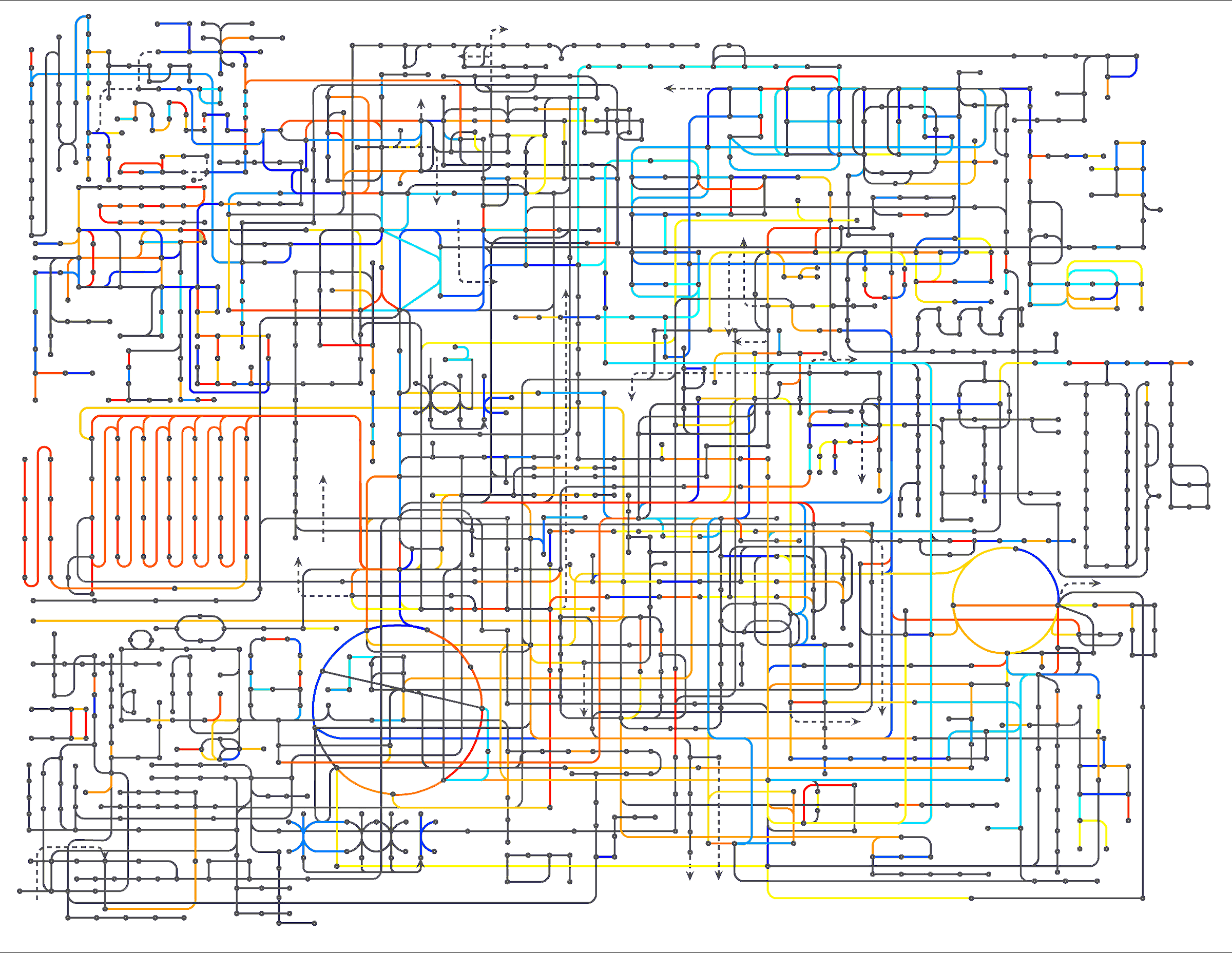 English: Artistic view of a simplified human metabolic network (human metabolome). In the left-bottom corner, the Krebs cycle, in the right-mid-side the Urea cycle, left-mid-side Fatty-acid beta-oxydation.