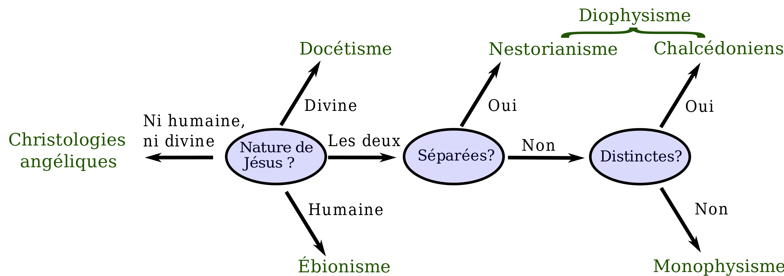 Français : Nature divine ou humaine de Jésus Controverses christologiques pré-chalcédoniennes. D'après Mircea Eliade, Dictionnaire des religions, Pocket, coll. « Agora », 1994 (ISBN 2-266-05012-5), p. 129.