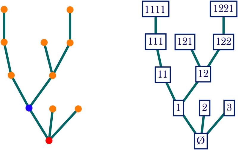 Français : Notation de Neveu pour les sommets d'un arbre planaire.