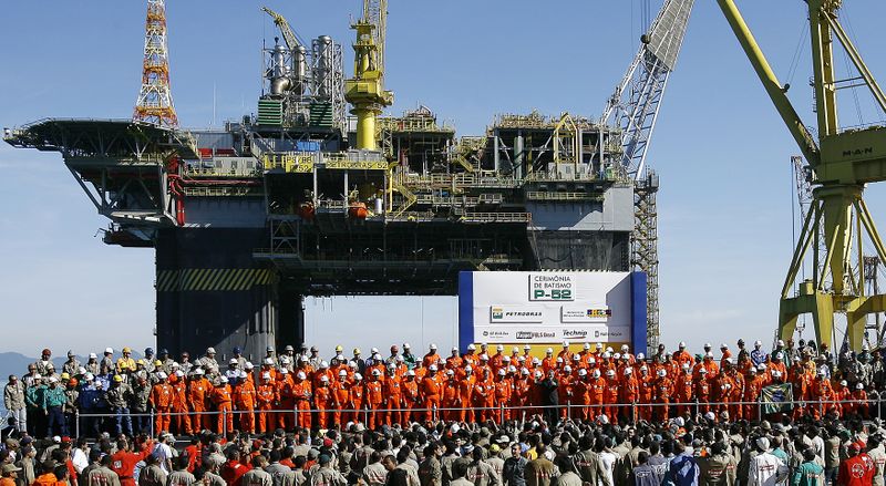 الرئيس آنذاك لويز إناسيو لولا دا سيلڤا في حفل افتتاح المنصة پ-52، بجانب عمال پتروبراس في أنگرا دوس ريس (حوض كامپوس المقابل لولاية ريو ده جانيرو). |