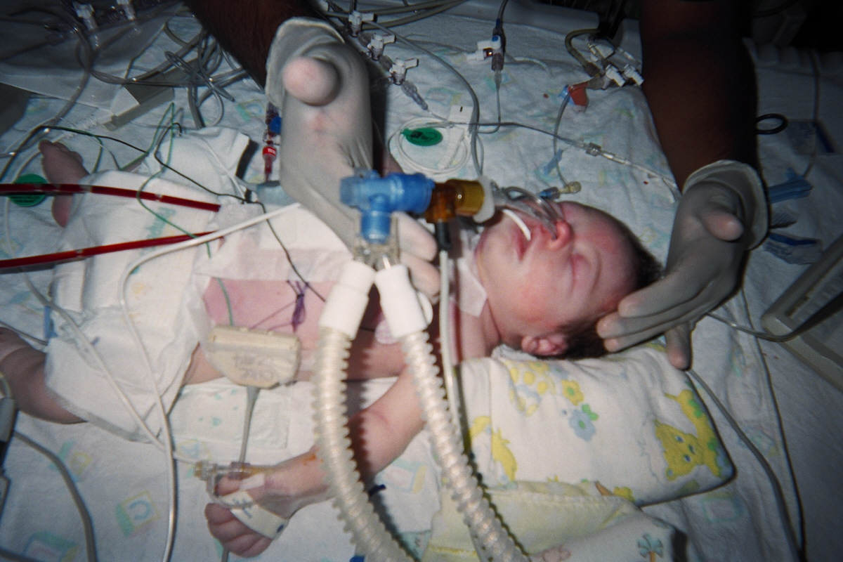 Location: PICU at BC Children's Hospital in Vancouver, BC, Canada. Subject: Amaryllis Kalilah Adoré Nicholson; 8 days old; d-TGA + VSD; Jatene procedure, immediate post-op. |