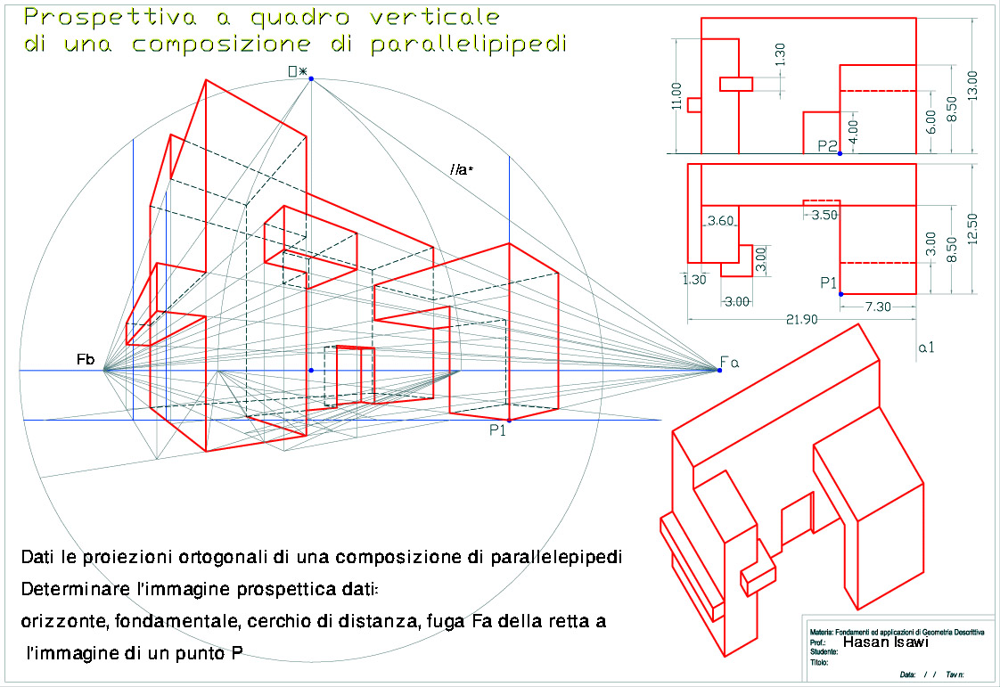 Dati le proiezioni ortogonali di una composizione di parallelepipedi Determinare l’immagine prospettica dati: orizzonte, fondamentale, cerchio di distanza, fuga Fa della retta a l’immagine di un punto P اعطيت الاسقاطات المتعامدة لمجسمات متوازية السطوح ارسم المنظور مع العلم انة معروف ما يلي: خط الأفق ، دائرة البعد ، نقطة التلاشي Fa للخط a , وصورة النقطة P |