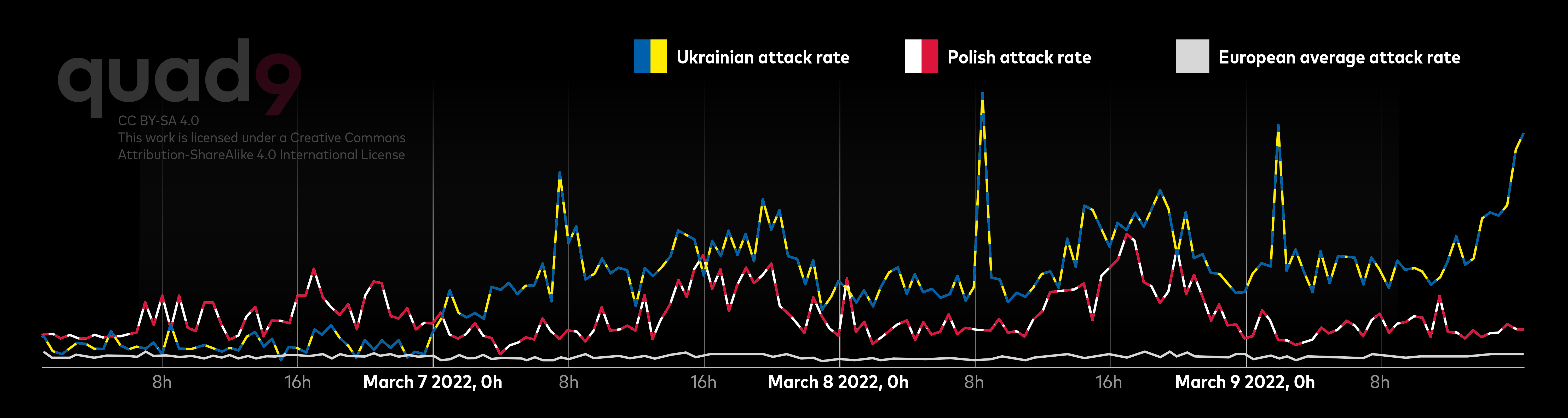 English: Ratio of DNS queries defensively blocked by Quad9 in Ukraine and Poland, March 7-9 2022.