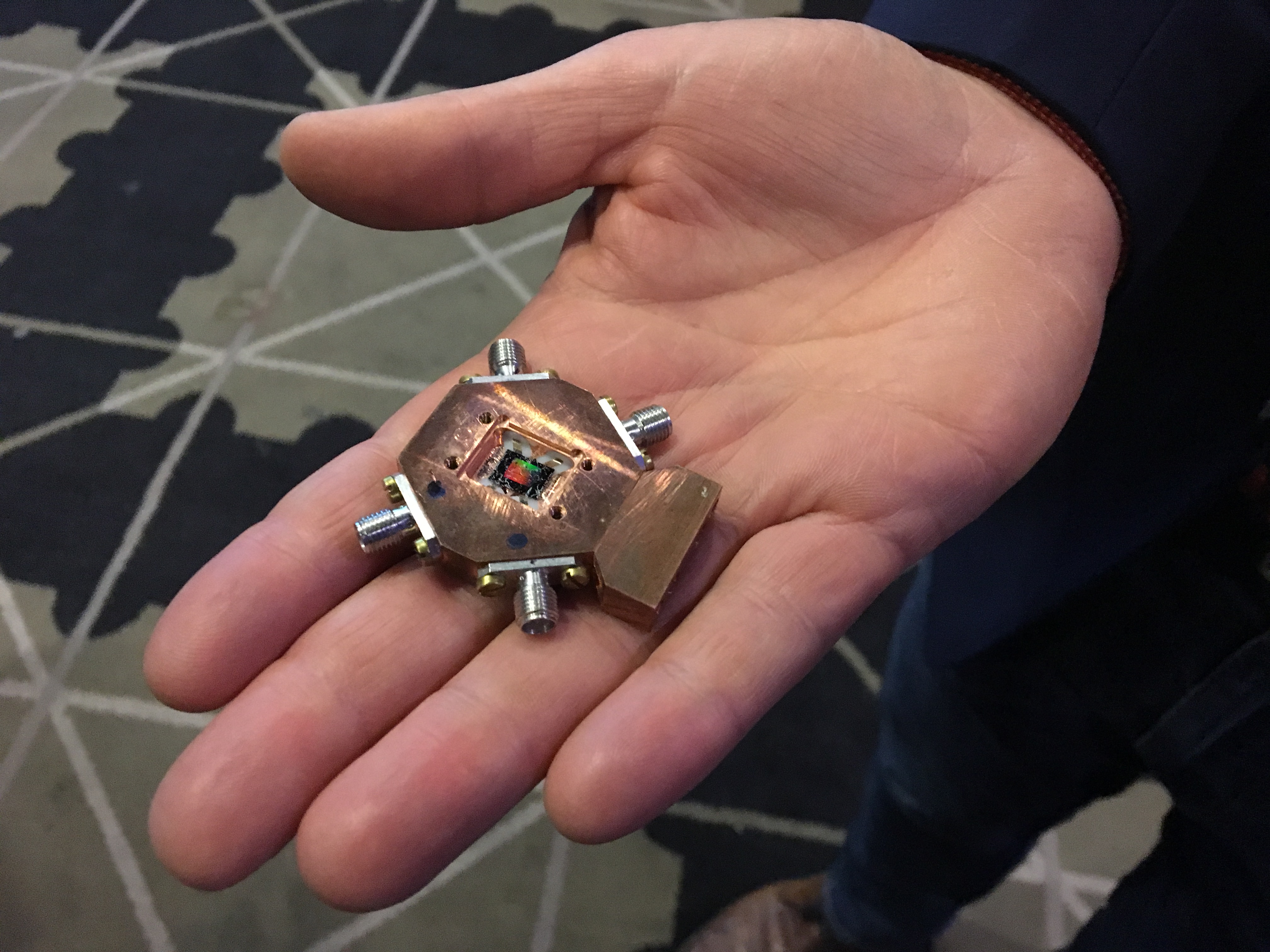 English: A quantum processor, for a quantum computer, with three quantum bits (qubits) and three read-out cavities, fabricated in May 2017 at the Nanofabrication Laboratory at Chalmers University of Technology.
