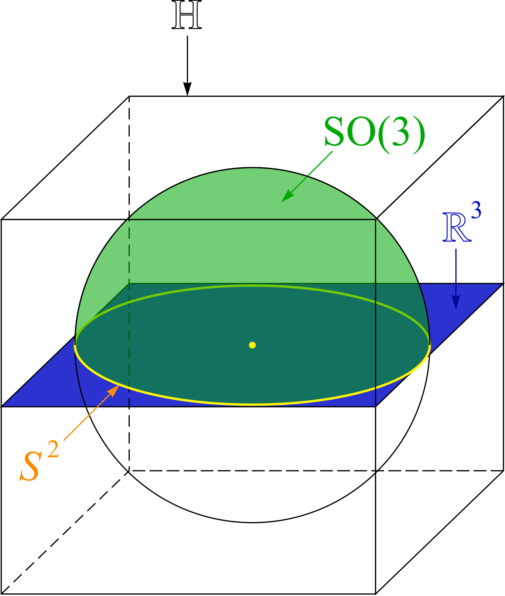 English: H (space of quaternions), SO(3) (3d special orthogonal group), R3 (3d real space), S2 (2d sperical surface, boundary of 3d sphere).