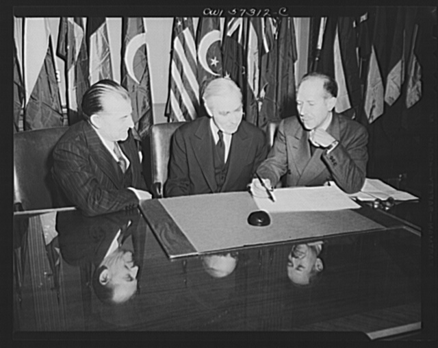 ممثلا مصر وتركيا يوقعان إعلان تأسيس الأمم المتحدة. أورهان إرالپ، القائم بأعمال تركيا، وجوسف گرو، نائب وزير الخارجية الأمريكي، يراقبان بينما الوزير المصري محمود حسن يوقّع الإعلان. في واشنطن العاصمة، 1 يناير 1945.[1]