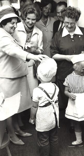 English: Photograph of Mrs. Rozalia Ochab, First Lady of Poland, visiting the Arabianmäki daycare center (kindergarten) in Helsinki. From left to right: Mrs. Ochab, Alicja Dawnis (interpreter) and Grete Ahlberg (head of the kindergarten).