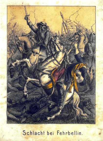 Schlacht bei Fehrbellin, aus: Bilder und Erzählungen aus der deutschen Geschichte. Mit 12 Illustrationen in Farbendruck nach Orig.-Zeichn. von O. Günther. Für die reifere deutsche Jugend. Reymann, Berlin 1863