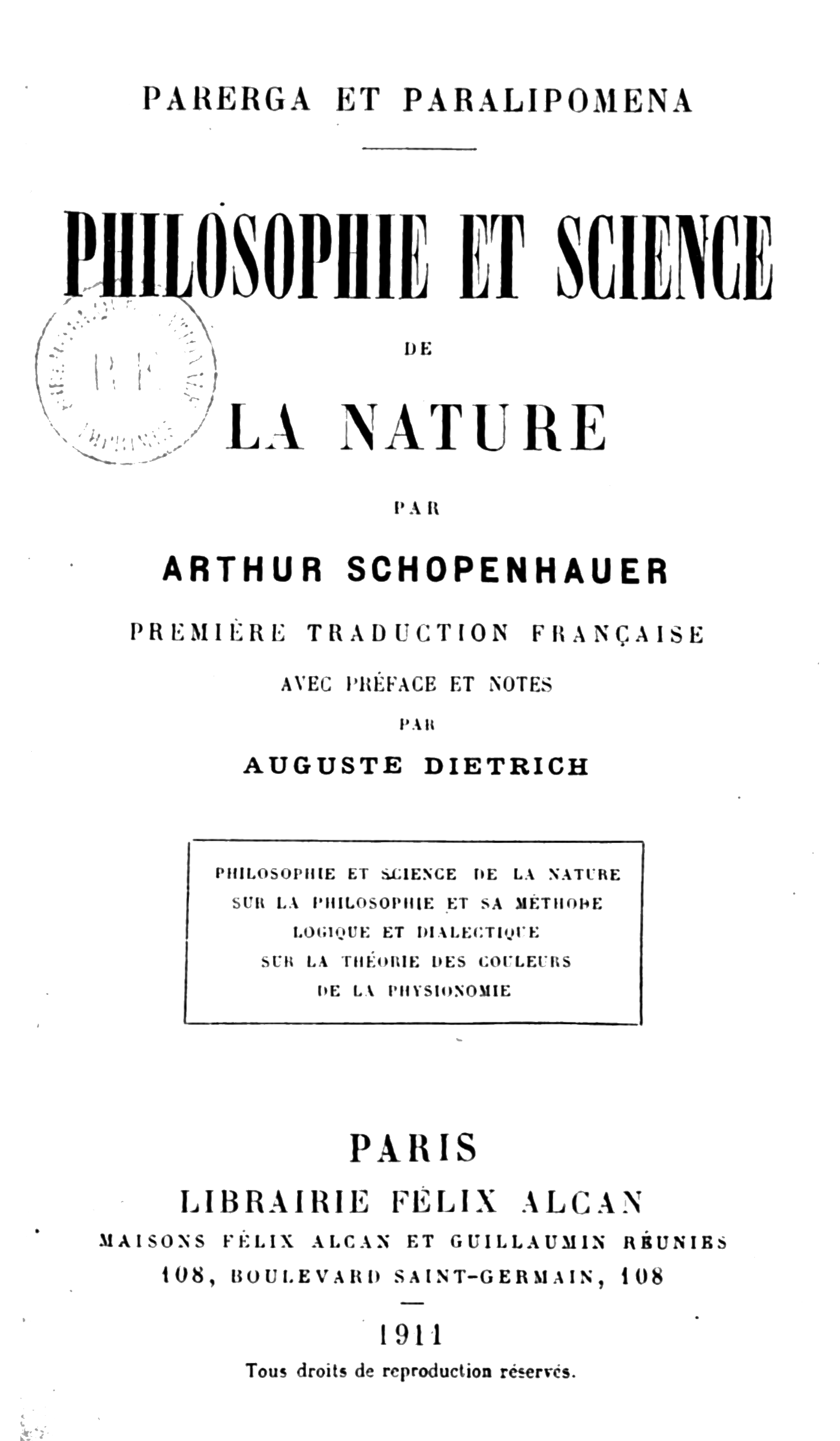 Français : Page de titre de : Arthur Schopenhauer.- Parerga et paralipomena. Philosophie et science de la nature. Première traduction française, avec préface et notes par Auguste Dietrich, Paris, 1911
