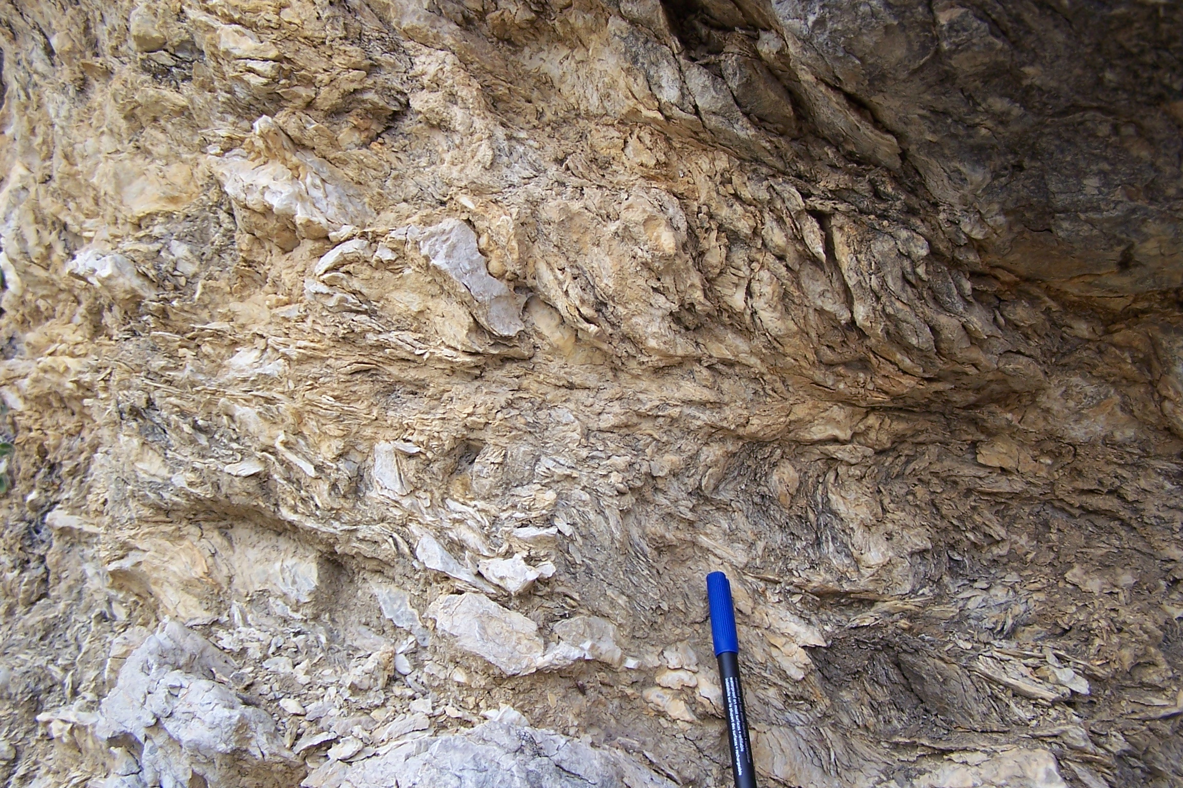 (Dutch) English: Shear zone at a thrust fault in rocks at Abella de la Conca in Catalonia, Spain. (Details based on description of this photograph in Dutch Wikipedia at https://nl.wikipedia.org/wiki/Schuifzone).