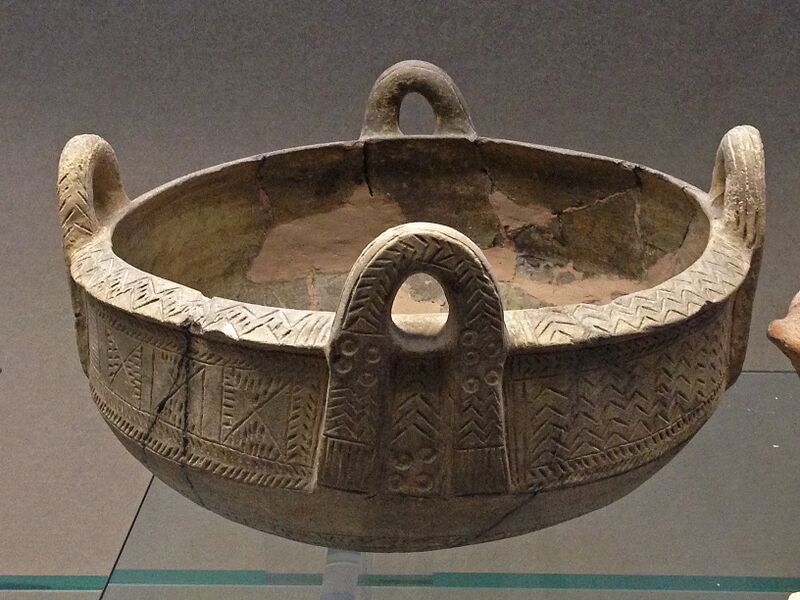 Italiano: Scodellone quadriansato con decorazione incisa. Necropoli sud di Pantalica