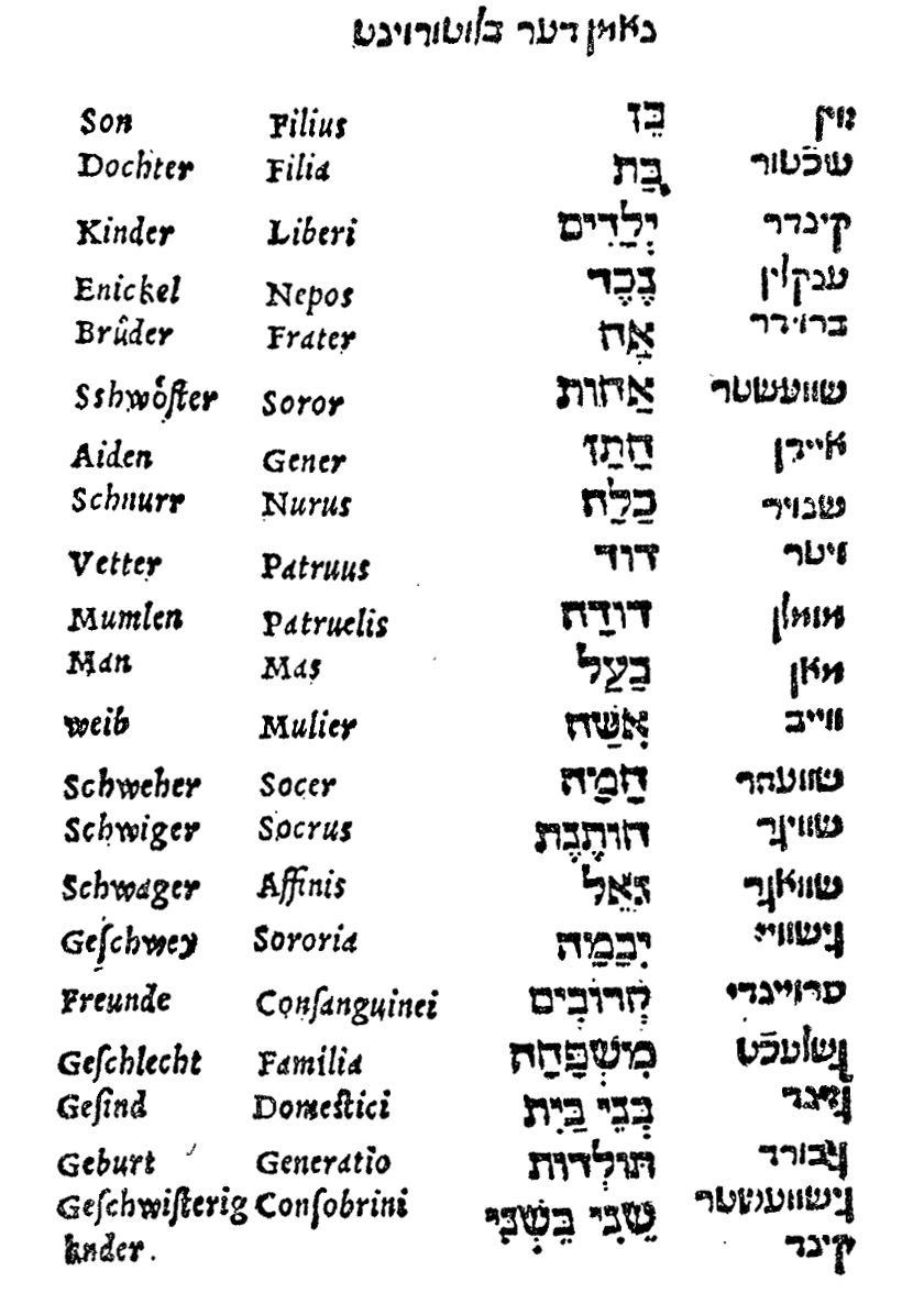 Deutsch: Eine Seite von Elijah Levitas „Schemōs Dworim“ oder „Nomenclatura Hebraica“ (Isny, 1542), reproduziert in Max Weinreichs „Schtaplen“ (Berlin, 1923, S. 85)